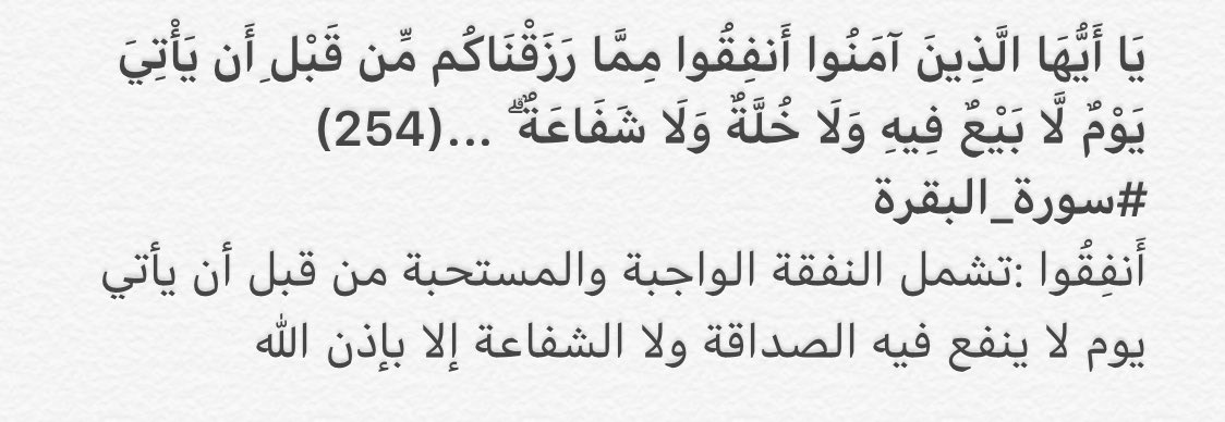 يَا أَيُّهَا الَّذِينَ آمَنُوا أَنفِقُوا مِمَّا رَزَقْنَاكُم مِّن قَبْلِ أَن يَأْتِيَ يَوْمٌ لَّا بَيْعٌ فِيهِ وَلَا خُلَّةٌ وَلَا شَفَاعَةٌ ۗ ...(254) #سورة_البقرة