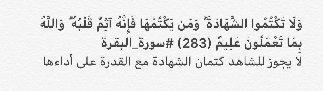 وَلَا تَكْتُمُوا الشَّهَادَةَ ۚ وَمَن يَكْتُمْهَا فَإِنَّهُ آثِمٌ قَلْبُهُ ۗ وَاللَّهُ بِمَا تَعْمَلُونَ عَلِيمٌ (283) #سورة_البقرة
