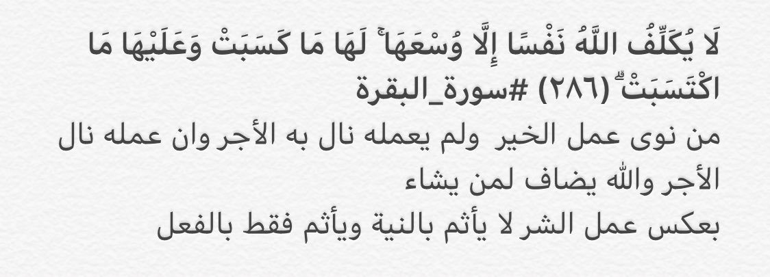 لَا يُكَلِّفُ اللَّهُ نَفْسًا إِلَّا وُسْعَهَا ۚ لَهَا مَا كَسَبَتْ وَعَلَيْهَا مَا اكْتَسَبَتْ ۗ(٢٨٦) #سورة_البقرة