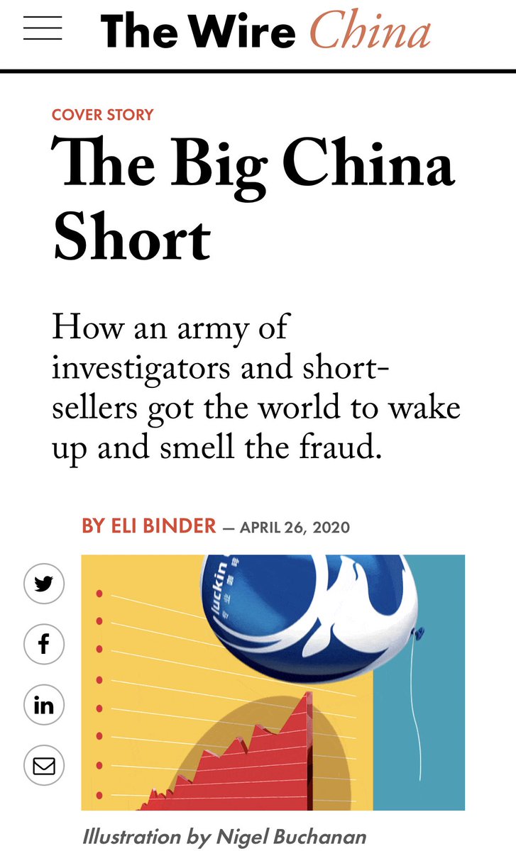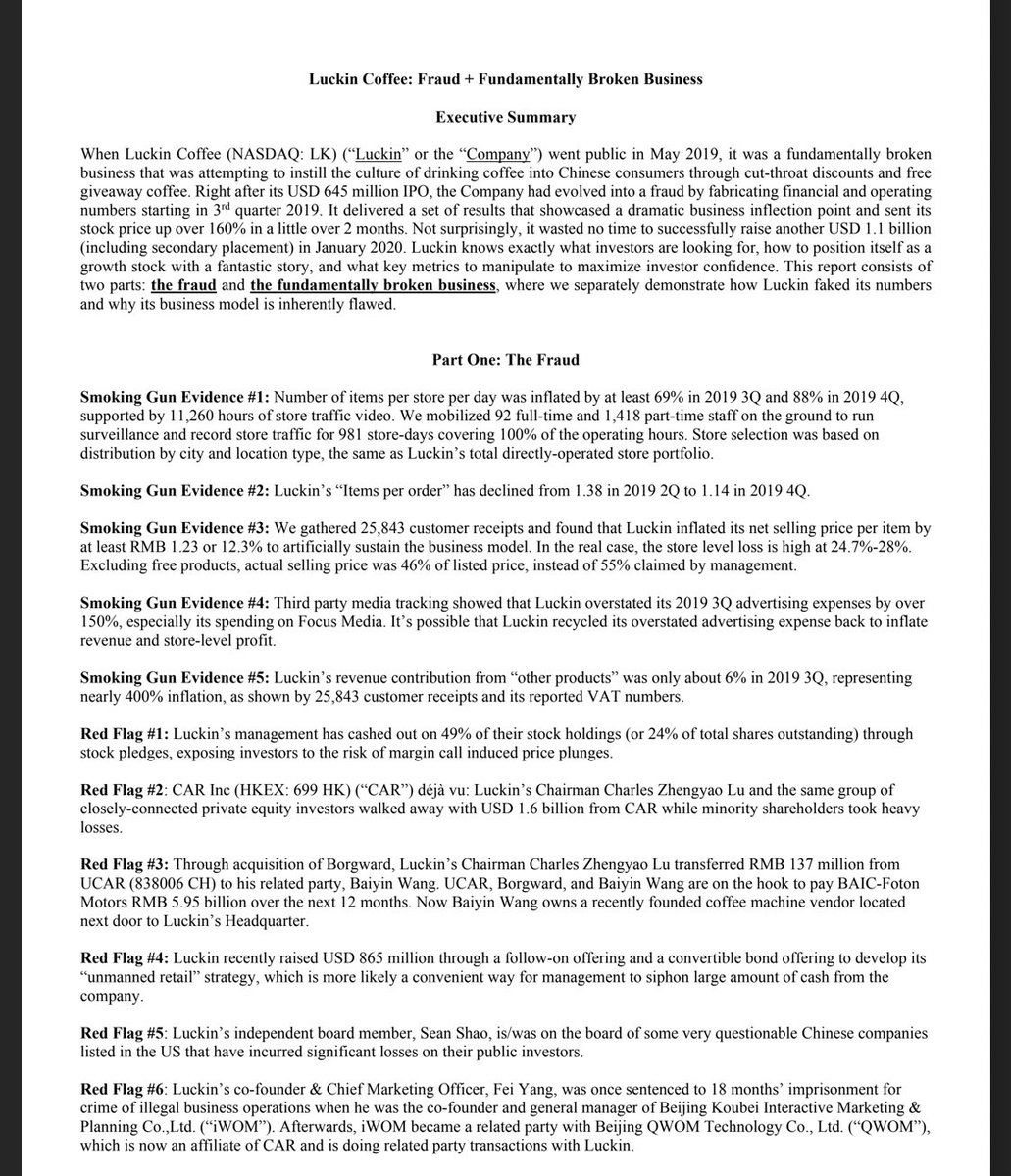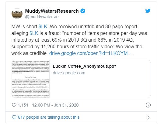 بعدها أعلنت @muddywatersre المعروفة بمراهنتها ضد الأسهم (Short Seller) بقيادة Carson Block عن وصول تقرير مجهولة الهوية يفيد عن تزوير الشركة لمبيعاتها ومع وجود ادلة وفيديو
