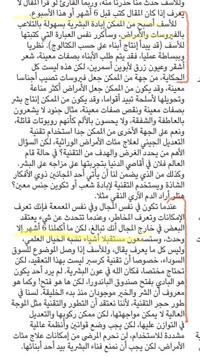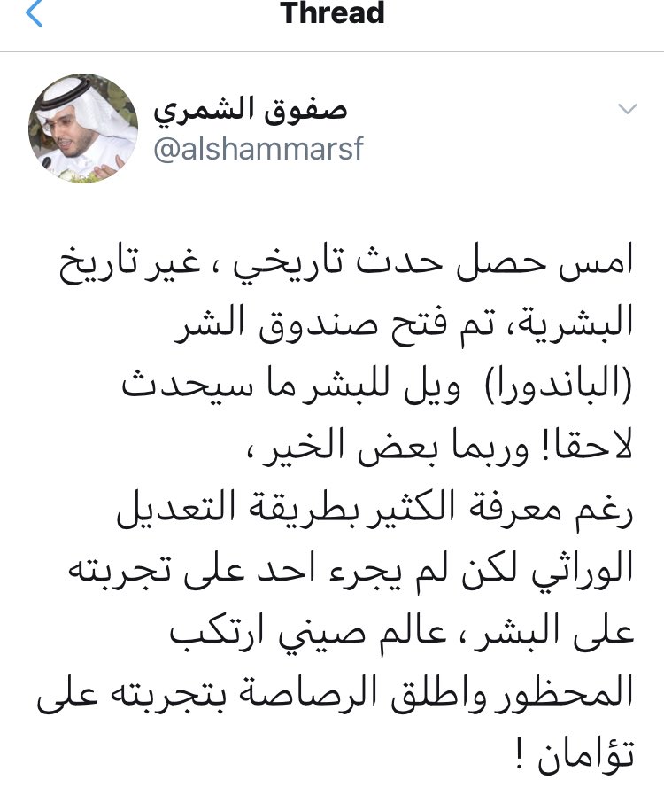 كان هناك احاديث وهمس ان في بعض الاماكن يحاولون لمس المحظور من اجل الخير ، لكن خوفنا كان من ان يفقدوا زمام التحكم ويتسرب شي او يستخدم في شر ، حذرت وبقوة قبل سنتين وكتبت : وَيَل للبشر من شر قد حظر!، ربما كنت حذرا خصوصا اني وقتها في لجنة وضع القوانين والخلاقيات الطبية