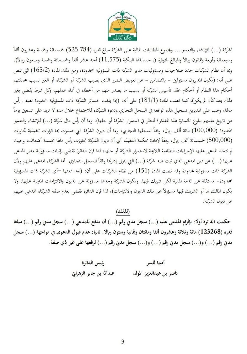 ختاما:الحكم وإن كان فيه عيوب خطيرة، لكنه مهم، ويعتبر حكماً نادراً في مسألة مهمة جداً ومؤثرة، وهي: مصير الديون في الشركات المحدودة والمساهمة، ومسؤولية المدراء والشركاء عنها