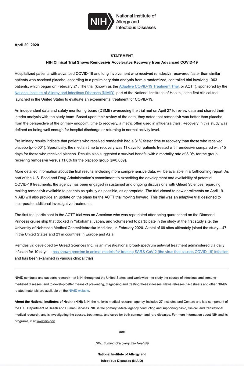 احس بشيء من خيبة الامل في هذا الدواء .. كنت انتظر منه نتائج اكبر من تخفيض مدة البقاء في المستشفى 4 ايام (من 15 مع الدواء الوهمي الى 11 مع ريميسيفير) ... عموماً علينا التريث لحين نشر الدراسات لنفهم اكثر قيمتها.