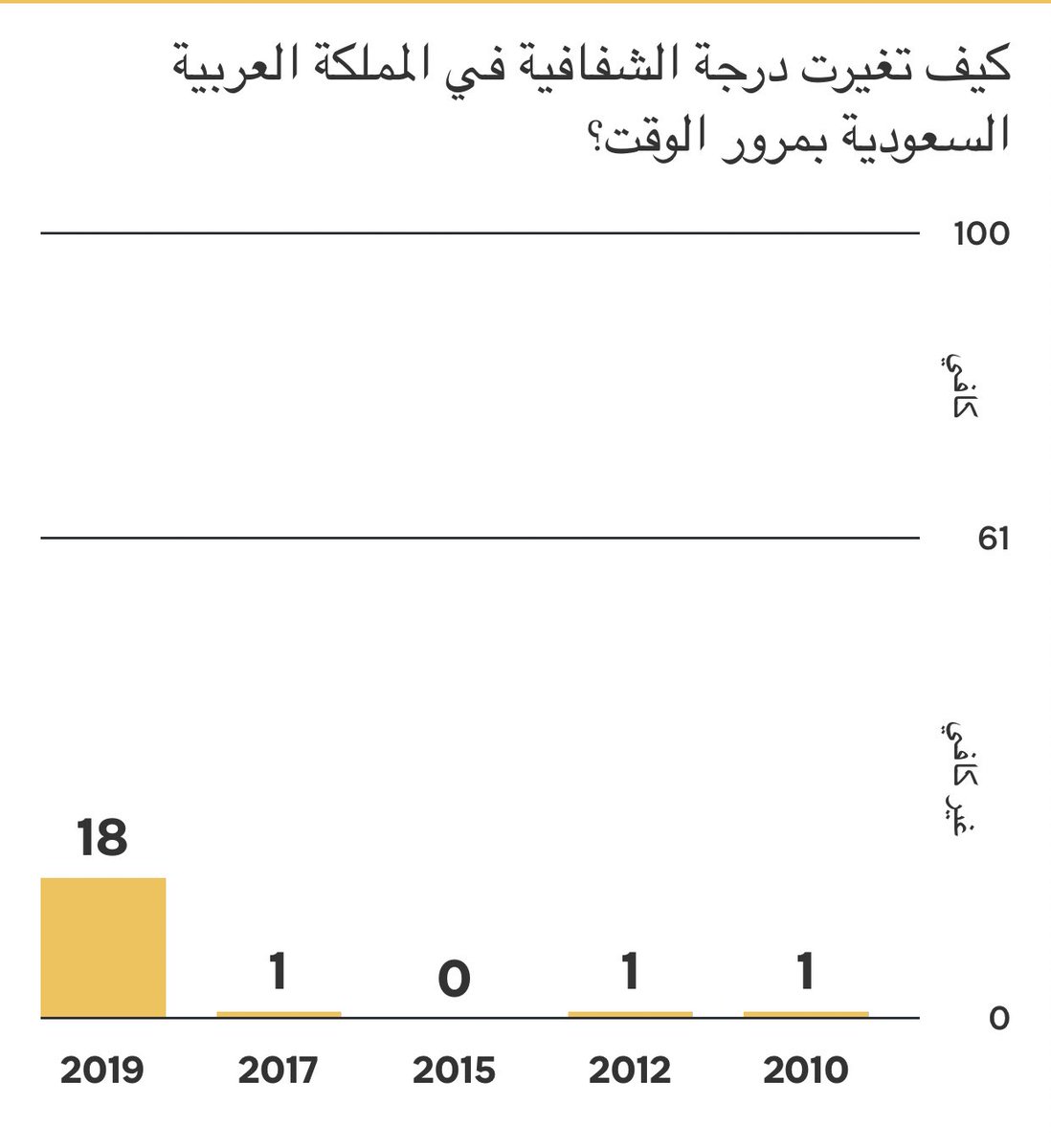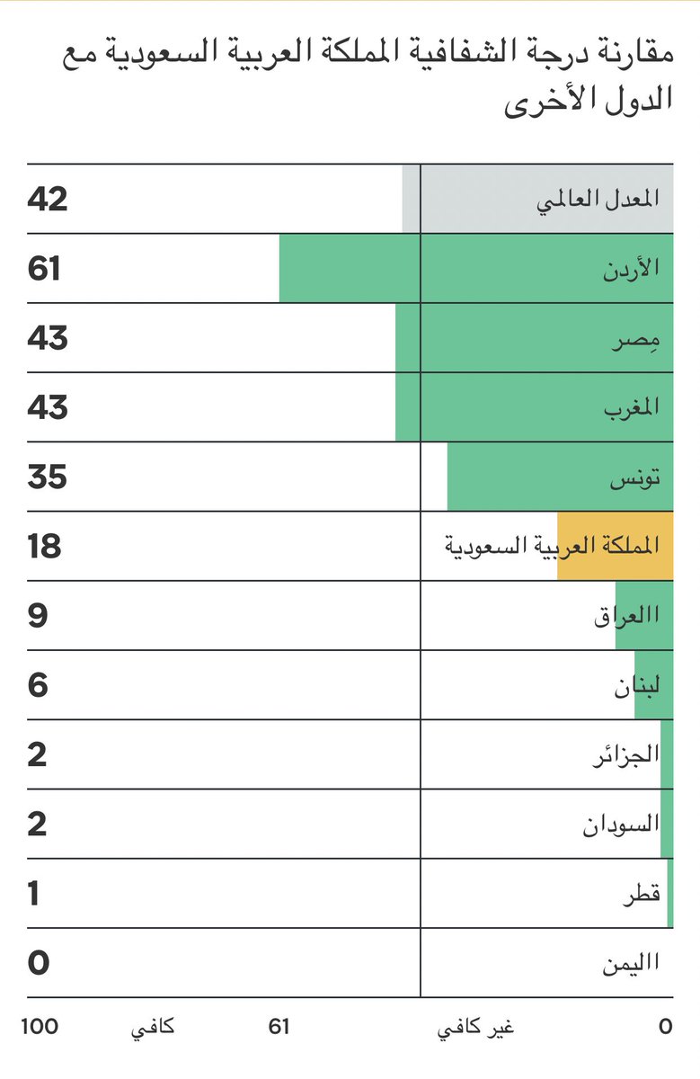 وهنا مقارنة لأداء #المملكة مع الدول العربية الداخلة في التقييم ومع المعدل العالمي حيث حققت 100/18 نقطة مقارنة بالمعدل العالمي الذي بلغ 100/42 نقطة؛ ومقارنة بنقطة واحدة فقط حققتها المملكة وفق الإصدارات السابقة.