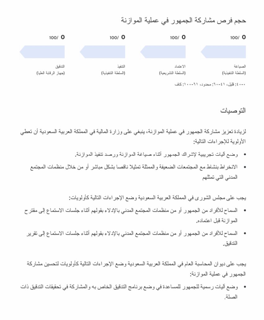 يعد مسح الموازنة المفتوحة هو الأداة البحثية الوحيدة في العالم المستقلة والمقارنة والقائمة على الحقائق والتي تستخدم المعايير المقبولة دوليًا في تقييم: