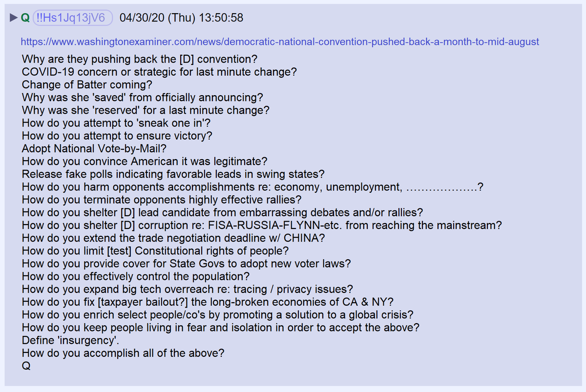 33) The DNC announced it will push back its presidential convention one month, supposedly due to Covid-19.