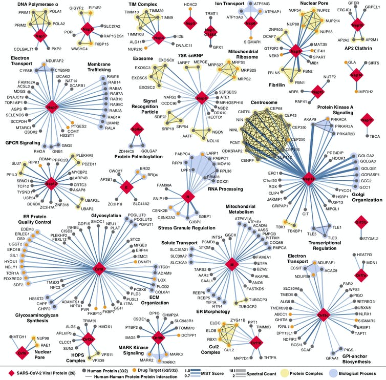 جاء في تفاصيلها، وعلى لسان كاتبها الرئيس الدكتور كروغان Krogan أنهم بذلوا جهدًا كبيرًا لإنشاء خريطة ضخمة لأماكن تفاعل فايروس كورونا المستجّد SARS-Cov2 مع بروتينات البشر (الصورة المرفقة أعلاه)، وأنهم حرصوا في بحثهم على إيجاد الأدوية المعتمدة التي أثبتت أمانها وفعاليتها على المرضى.