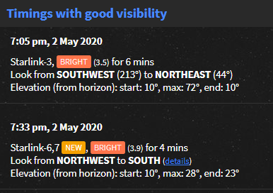 ومن ثم تشاهد ستارلنك 6 و7 في نفس الليلة الساعة 7:33م من الشمال الغربي متجهه ناحية الجنوب .. هذا والله أعلم.