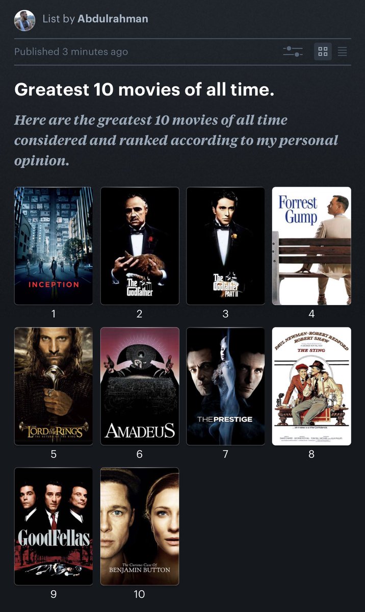 اليوم جايب لكم ثريد الثريدات، ثريد بنزل فيه أفضل ١٠ أفلام من كل فئة. يعني أفضل ١٠ أفلام أكشن، أفضل ١٠ أفلام دراما، جريمة، غموض، رعب الخ....... بحط لكم كل الفئات. ثريد بحط فيه كل شيء و بيكون متكامل. بيتوفر فيه جميع الأذواق. طب و اختر اللي يناسبك. مشاهدة ممتعة ?