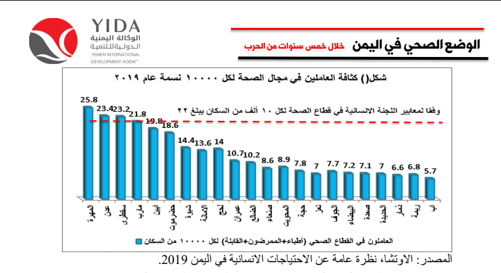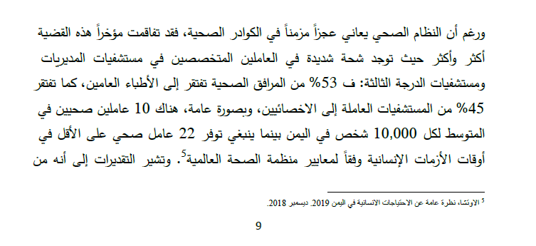 تقرير الأوتشا 2019: 53% من المرافق الصحية تفتقر للأطباء العاملين كما تفتقر 45% من المستشفيات العاملة إلى الاخصائيين، وبصورة عامة هناك 10 عاملين صحيين في المتوسط لكل 10000 شخص في #اليمن بينما ينبغي توفر 22 عاملا في وقت الأزمات وفقا لمعايير منظمة الصحة.