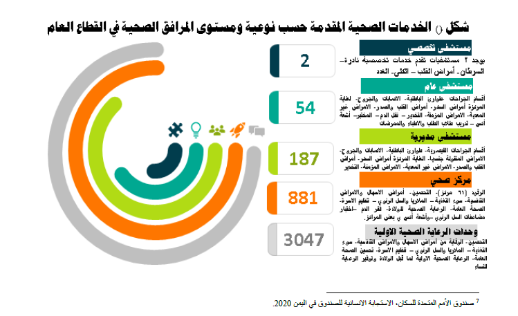 من أصل 267 مديرية تم تقييمها، كان هناك 49 مديرية ليس فيها دكتور واحد، وفي 42% من المديريات يوجد أقل من 2 دكتور في المرافق الصحية.