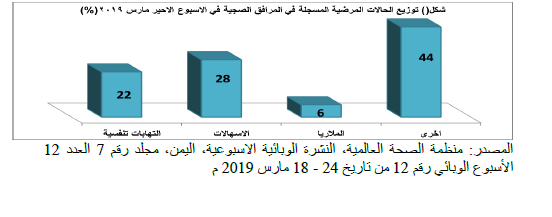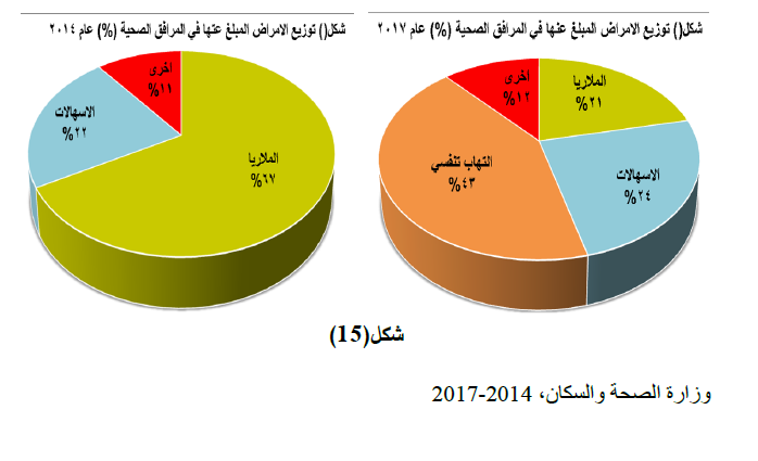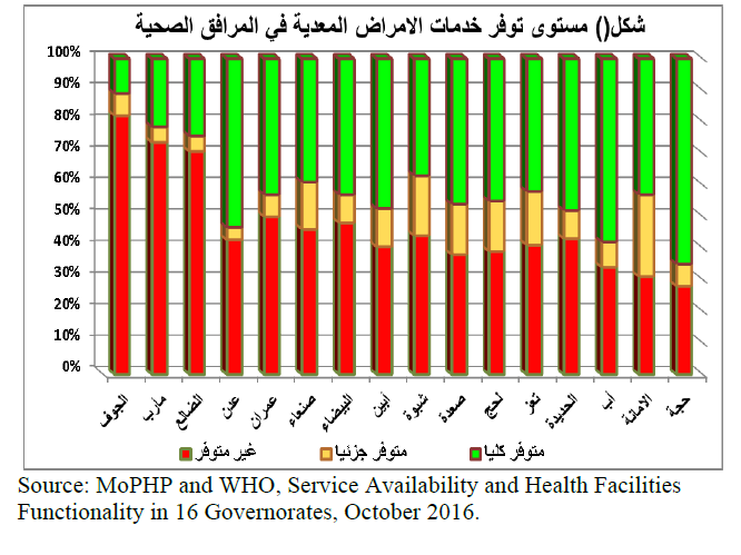 من مستويات مرتفعة ومقلقة لعدم توفر خدمات الأمراض المعدية بنسبة تفوق 60%. وبوجه عام كان 43% فقط من المرافق الصحية العاملة يتوفر لديها خدمات مكتملة لمعالجة الأمراض المعدية بينما 40% توفرها جزئيا و 17% لا توفرها كليا.