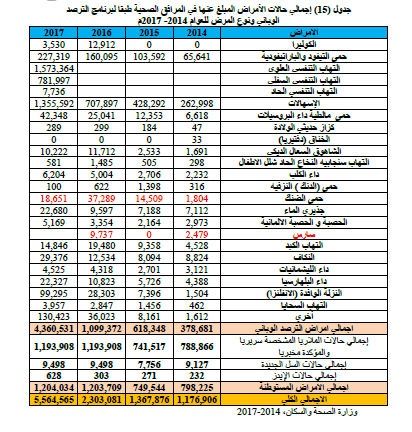 تأملوا جيداً في هذا الجدول لتعرفوا عدد الأمراض الكثيرة التي انتشرت خلال هذه السنوات وبعضها عاد بعد أن كانت بلادنا قد تخلصت منه قبل سنوات طويلة.