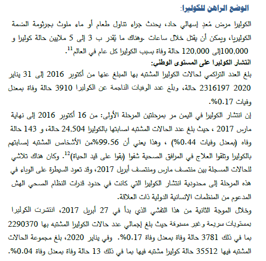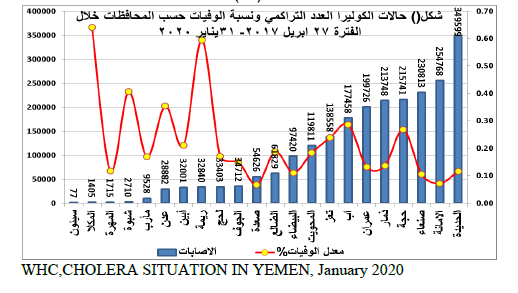 بلغ العدد التراكمي لحالات الكوليرا المشتبه بها واليت تم الإبلاغ عنها من أكتوبر 2016 إلى 31 يناير 2020 أكثر من مليوني حالة، وبلغ عدد الوفيات الناجمة عنها 3910 حالة بمعدل وفيات 0.17%.