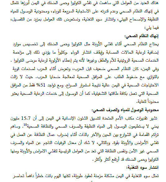 أبرز العوامل في تفشي الكوليرا وحمى الضنك إنهاك النظام الصحي وعدم قدرته على الاستجابة السريعة للوباء ومحدودية الوصول للمياه النظيفة والإصحاح البيئي، حيث تشير تقديرات مكتب الأمم المتحدة لتنسيق الشؤون الإنسانية في #اليمن إلى أن 15.7 مليون يمني لا يستطيعون الوصول للمياه النظيفة..