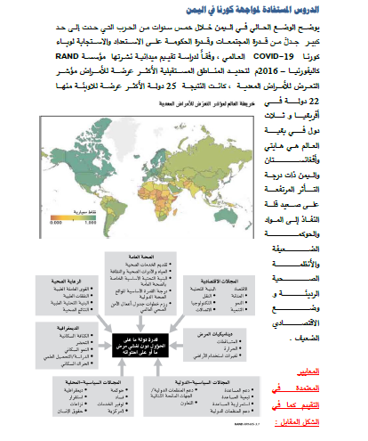 يوضح الوضع الحالي في #اليمن خلال خمس سنوات من الحرب التي حدّت إلى حد كبير من قدرة المجتمعات والحكومة على الاستعداد والاستجابة لوباء كورونا. وفقا لدراسة أمريكية نُشرت عام 2016 لتحديد المناطق المستقبلية الأكثر عرضة للأمراض (مؤشر التعرض للأمراض المعدية) كانت النتيجة 25 دولة..
