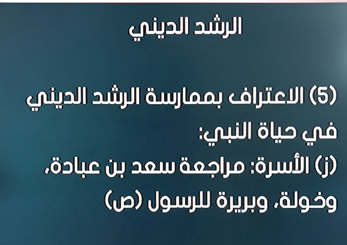 والعديد من مواقف في حياة الصحابة مثل سعد بن عبادة و كيف يتصرف الرجل اذا وجدداحدا مع امراته وخولة التى اشتكت حكم الظهار نزل فيها قرآن وبريرة التي احبها زوجهاكثيراوهي تبغضه ودعاهاالرسول لتعود لزوجها ورفضت وقالت لاحاجة لي فيه.. اليس هذا هوالرشدالديني؟