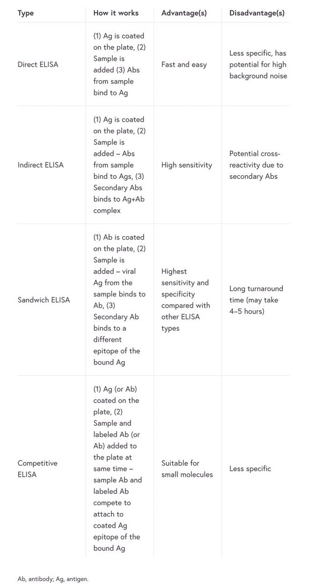 غداً ان شاء الله نكمل بجدول يصف الأنواع الرئيسية من اختبارات ELISA ، ويوضح مزايا وعيوب كل نوع ... انتظرونا