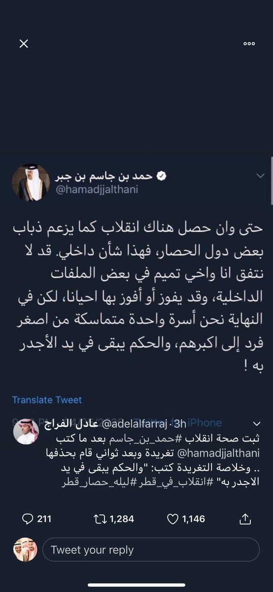 نجاح مخابرات #تركيا و #ايران و #اسرائيل في إنقاذ نظام الحكم سيكون له تبعاته. وعقلاء أسرة #آل_ثاني يخشون من تبعات سياسية ومالية وأمنية مكلفة في وقت تعاني #قطر من تكلفة #كورونا وتعويضات مشاركتها في قتل #قاسم_سليماني ودعم الليرة التركية و #حماس عن طريق #الموساد. #إنقلاب_في_قطر