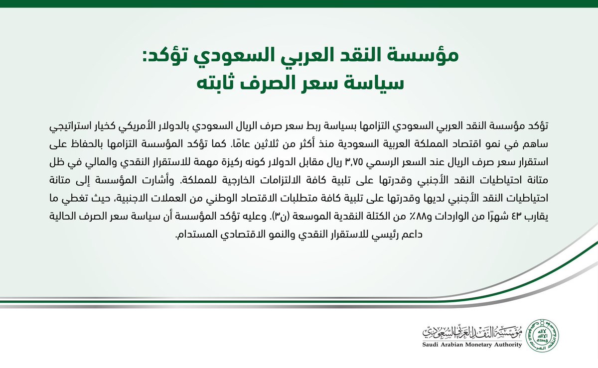 ١- خرجت تقارير اعلامية حول تخفيض سعر الصرف devaluation للريال السعودي مقابل الدولار الامريكي وطلب مني أحد الاعزاء التعليق حول ذلك فقلت له باختصار هذه تقارير مغلوطة ولا يمكن ذلك في حين نفت اليوم #مؤسسة_النقد العربي السعودي ..