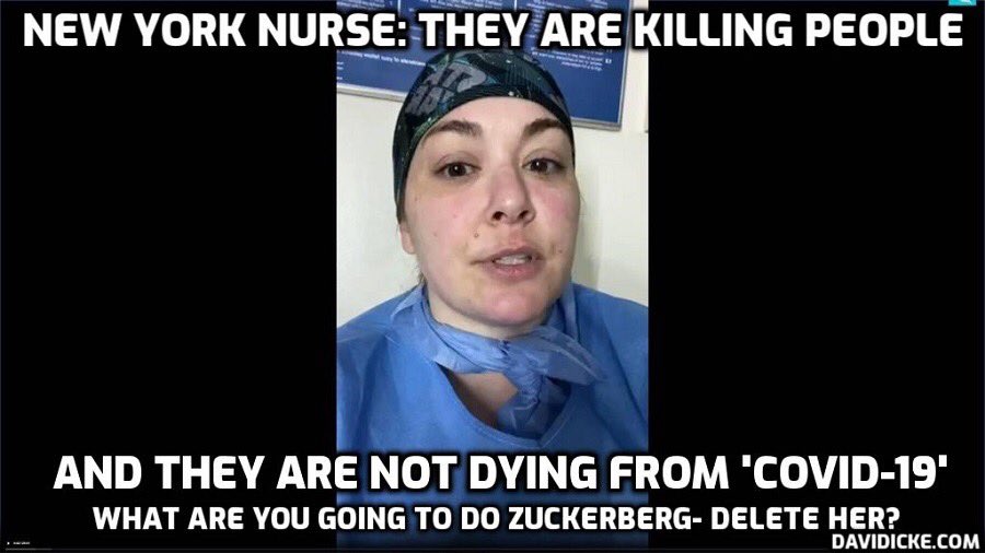 ممرضة تتحدث عن حال العلاج في بعض مستشفيات نيويورك. تقول بالحرف الواحد انهم يقتلون المرضى. وان هناك طبيب عناية مركزة في احدى مستشفياتهم نشر مقطع يقول فيه ان هناك شيء خاطىء، واننا نقتل المرضى لا نعالجهم، فحذف يوتيوب مقطعه وتم رفده من منصبه.