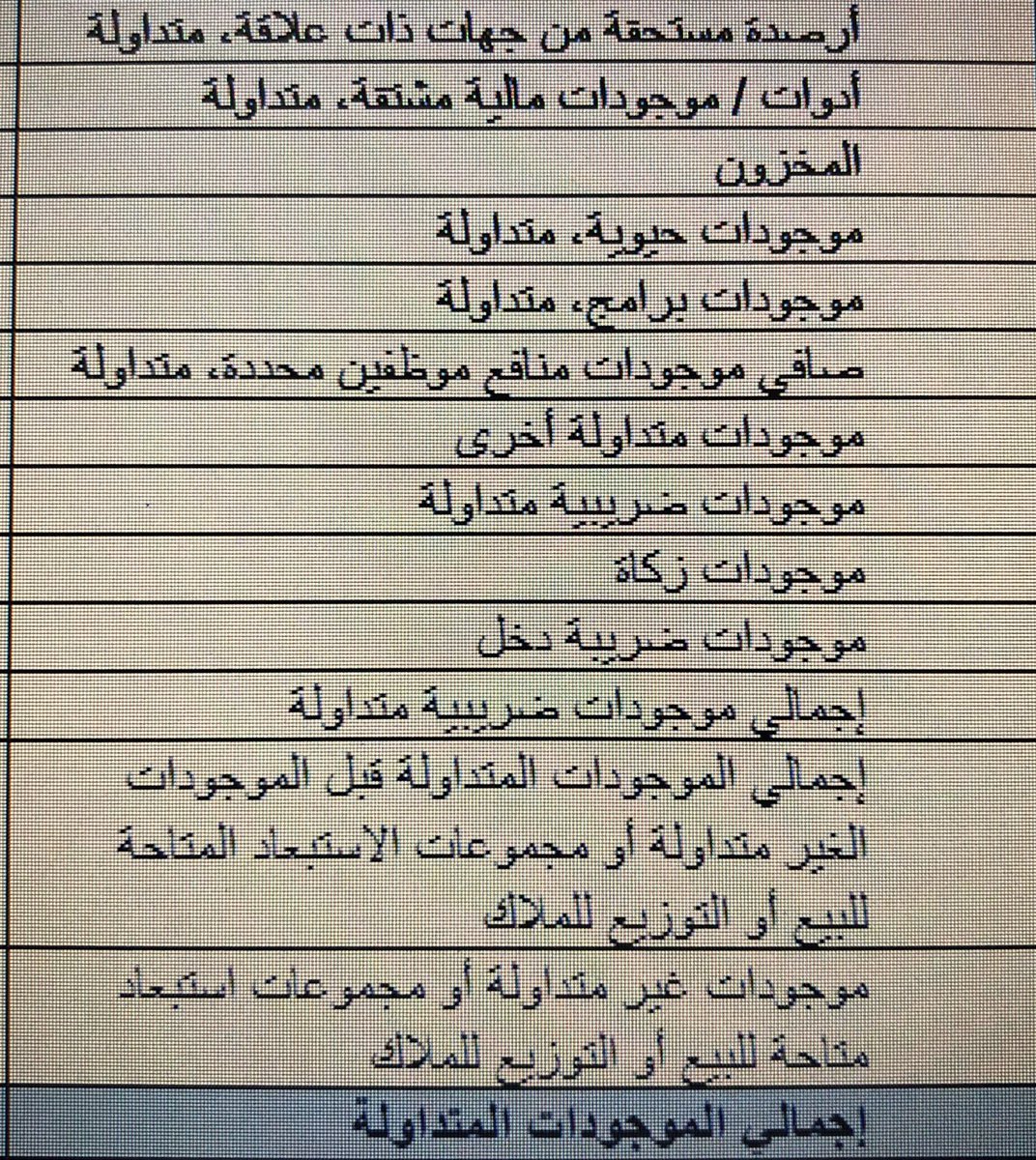 •المبالغ المدينة. مثل( التجاريين وغيرهم وذات العلاقة منفصل) اذا كانت ناشئة عن تمويل يجب ان يتم تفصيله حسب التمويل مثل تمويل مرابحة وغيره)