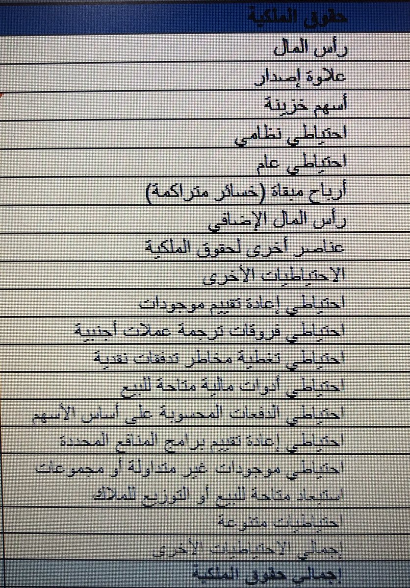 •فئات حقوق الملكية مثل رأس المال، علاوة الإصدار، الأرباح المبقاة وبنود الدخل الشامل المعروضة بشكل منفصل في حقوق الملكية مثل