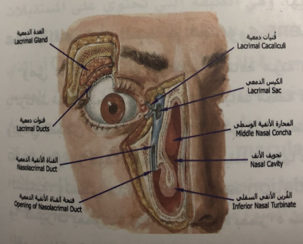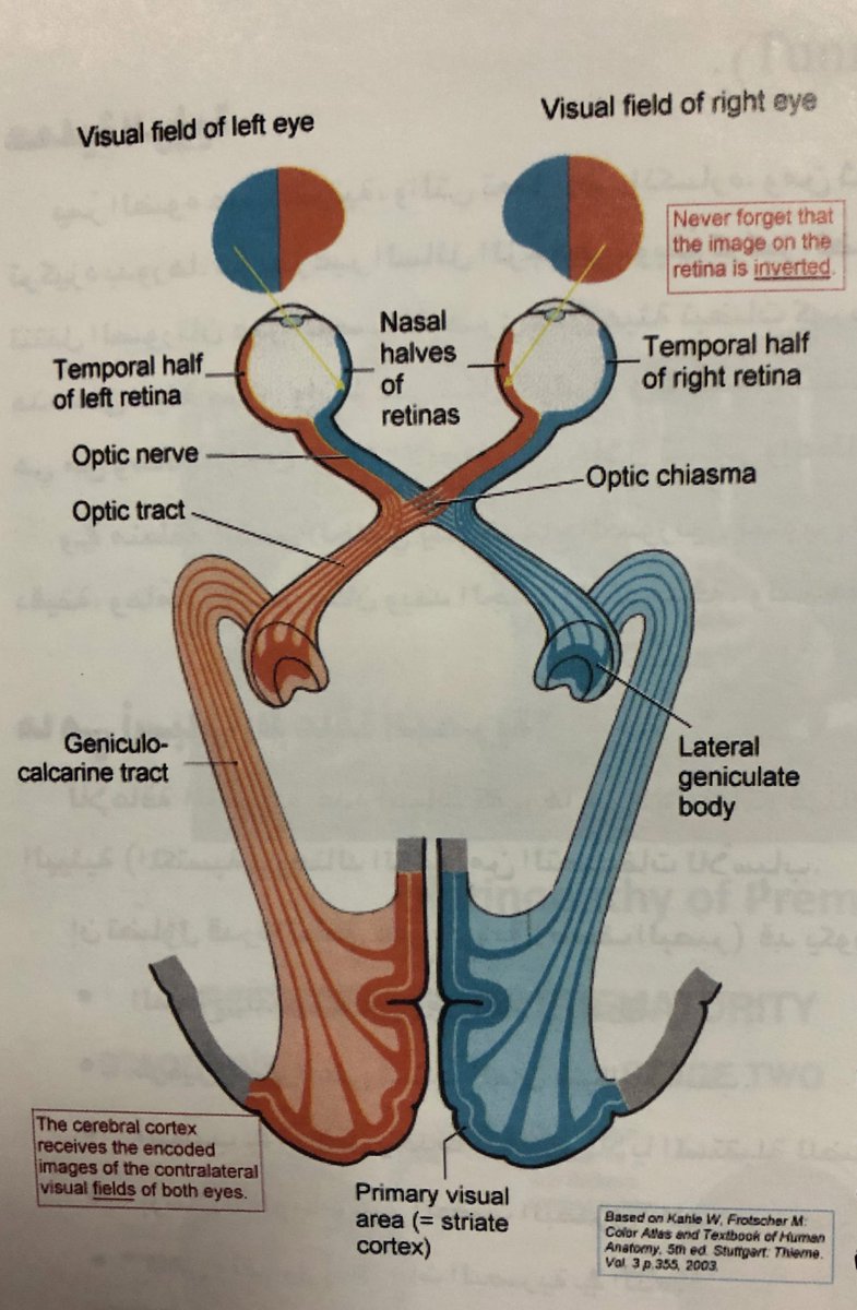 من العين عند حليمة العصب البصري إلى الحجاج، ثم إلى داخل الجمجمة عبر النفق البصري، ليصل إلى التصالب