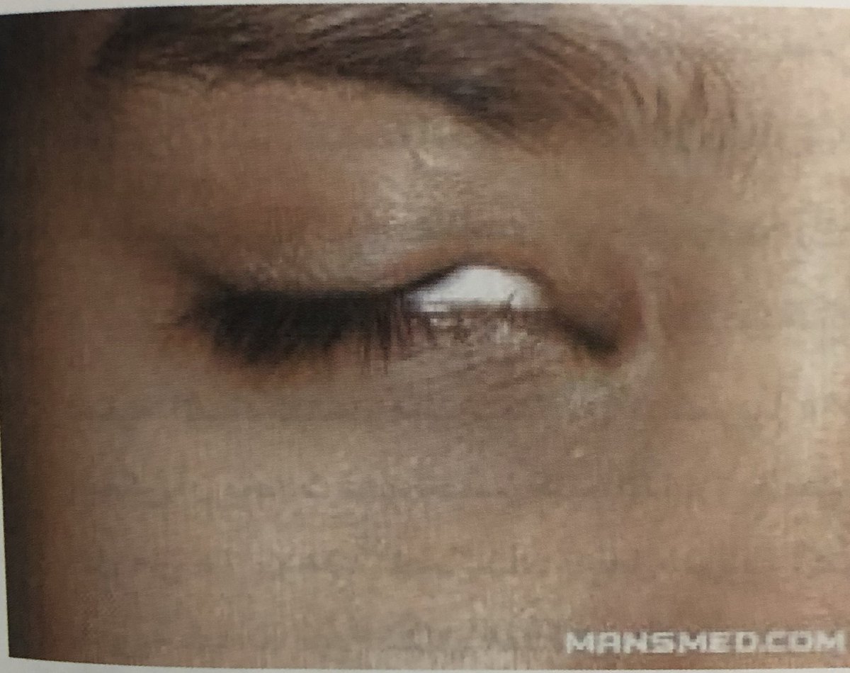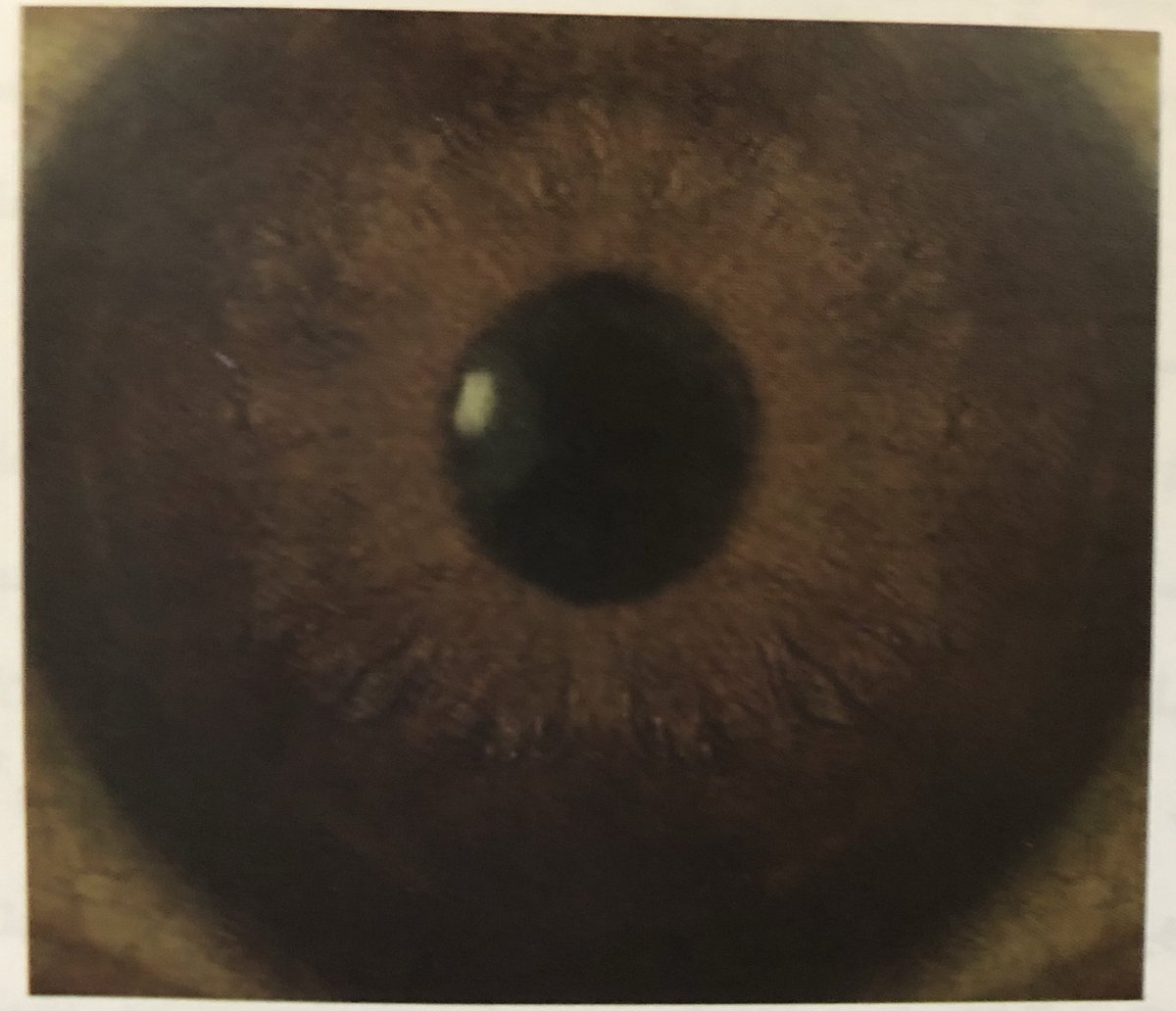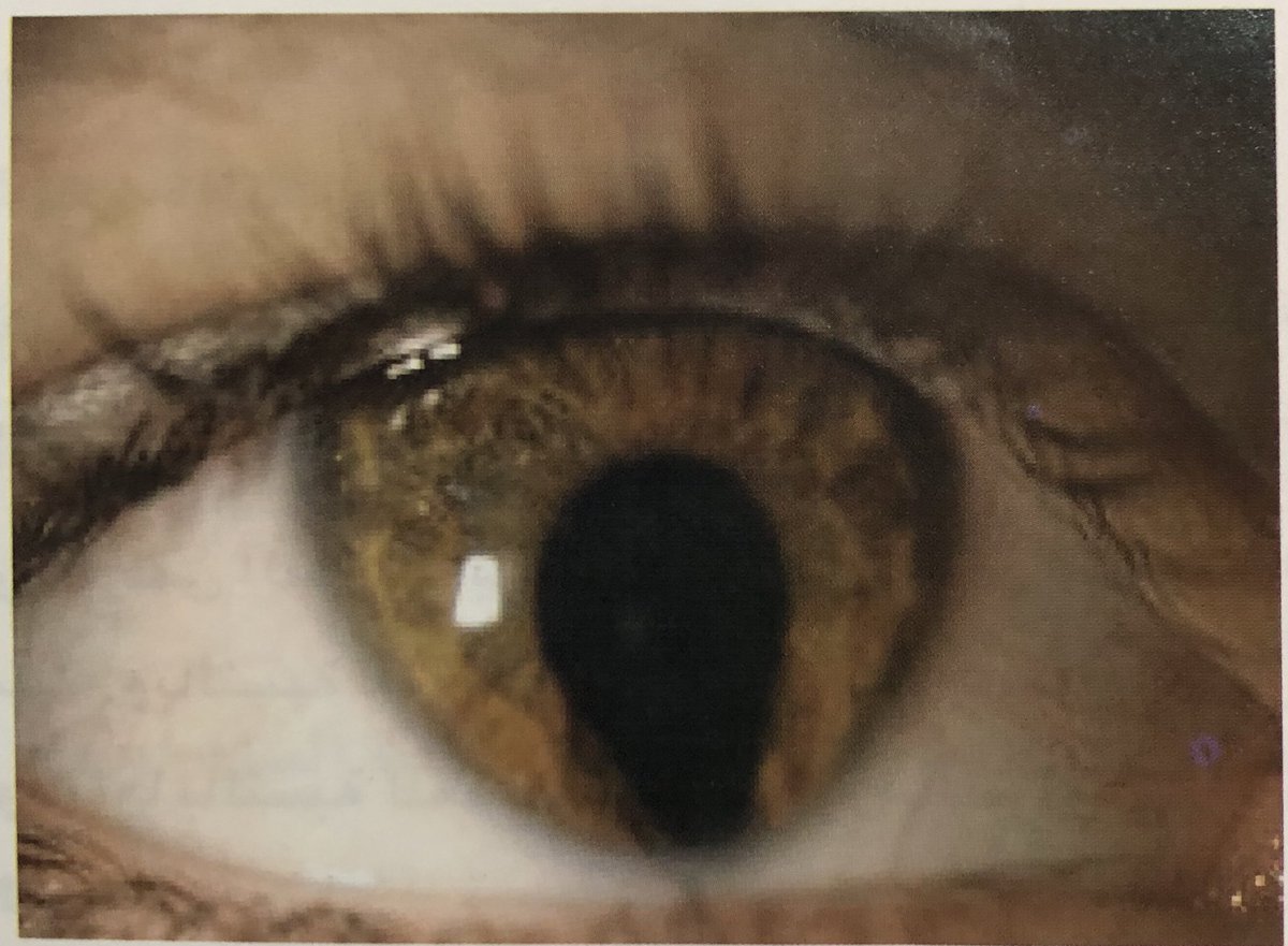 تكون الحدقة واسعة جداً نتيجة غياب القزحية جزئيا أو كاملا في كلتا العينين، ويؤدي إلى حساسية مفرطة للضوء وضعف في حدة الإبصار،