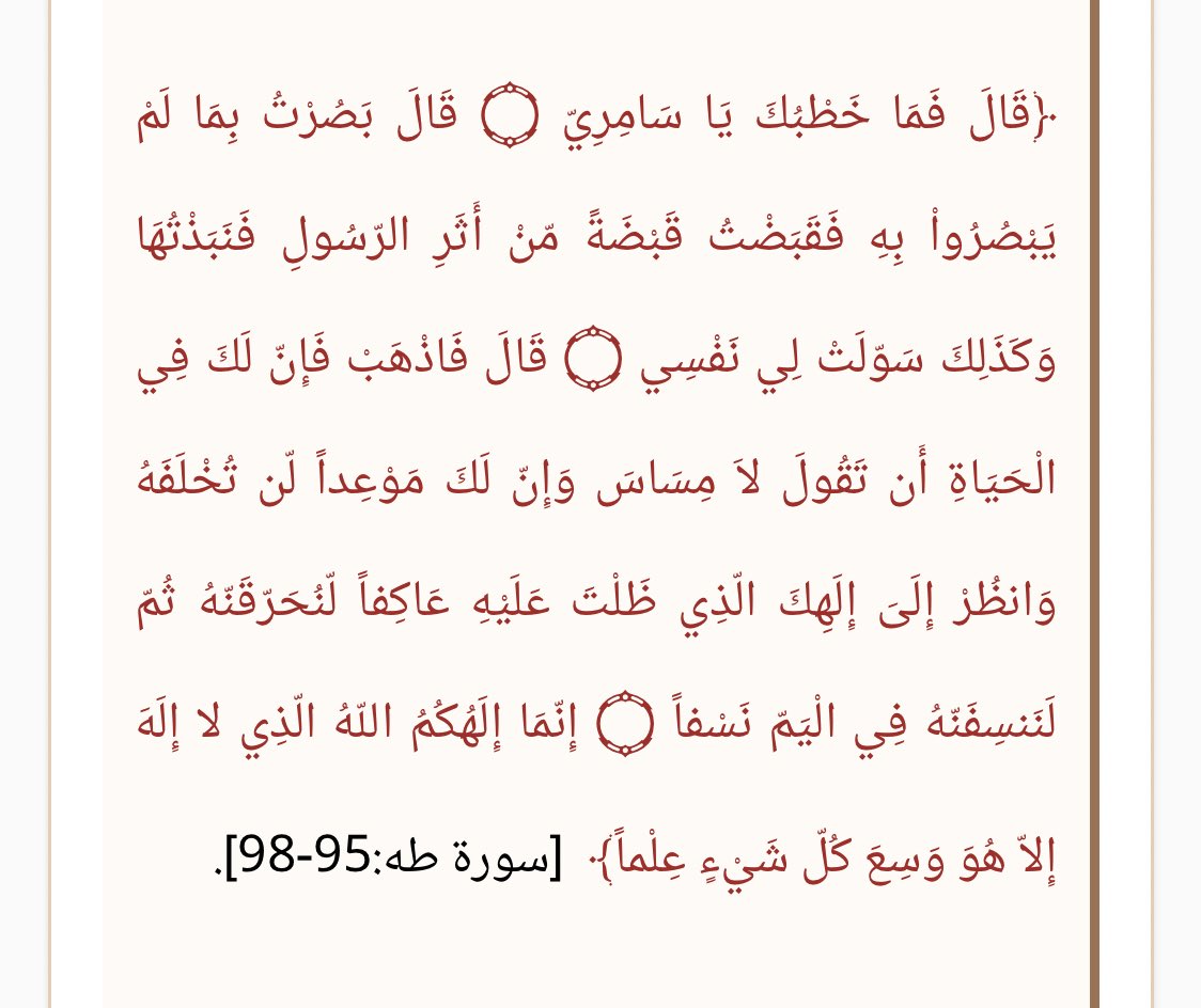 فختيتها في العجل بعد ما سويتو عشان يبقى فيه جزء من اثر الملائكة عشان أصبرهم لغاية ما انت تجي ! فتصرف سيدنا موسى بانهاء الفتنة و عاقب السامري