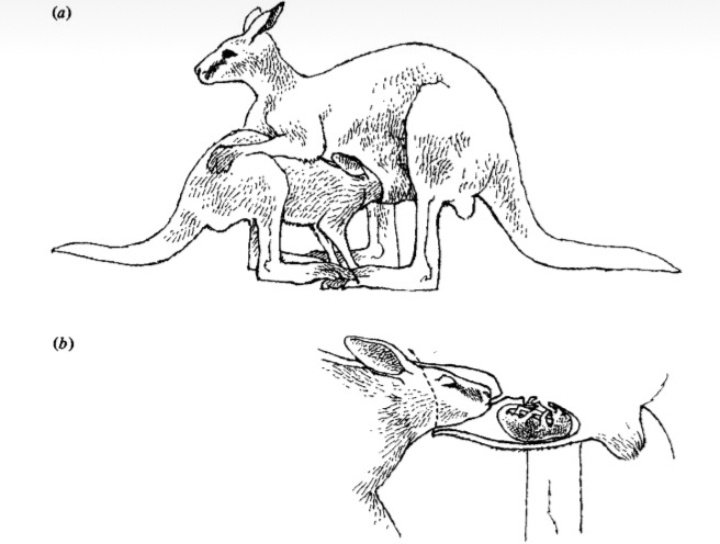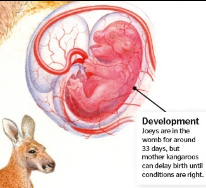 ومش بس هيك الأنثى بتقدر تتحكم بالحمل وتوقف نمو الجنين حسب الظروف المحيطة فيها اسمها هاي الشغلة embryonic diapause. بحكم انو الكنغر بالعادة بعيش بظروف بيئية جدا قاسية من شح مياه و غذاء. وبس يتحسن الوضع برجع يكمل الحمل طبيعي.