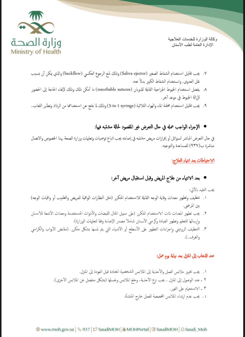 يفضل الاتصال على جميع المرضى قبل حضورهم وسؤالهم عن وجود حرارة، كحة، ضيق تنفس. والتأكد من عدم مخالطتهم لمرضى كورونا أو اصابتهم مسبقًا او خروجهم من عزل او حجر ومدته كامله.