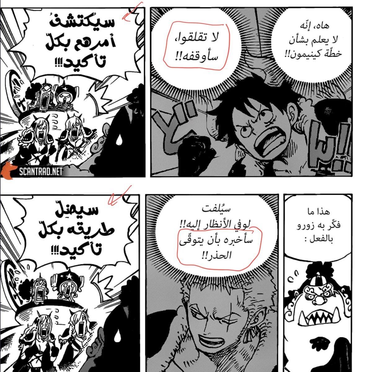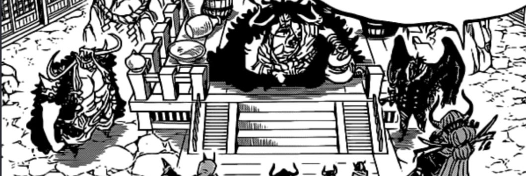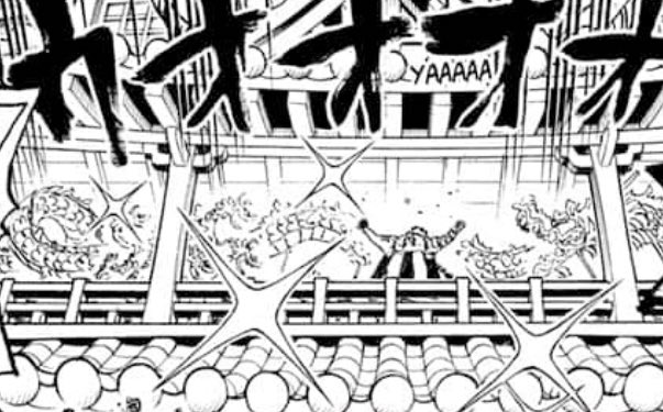 الآن هم حاصروا تقريبا كايدو هنا نرى مدى عبقرية لاو في الخطط لوفي وكيد وزورو سيثيرون إنتباه كايدو وأيضاً من ما سيسمح على الجانب الأيمن و الأيسر لمسح قوات كايدو
