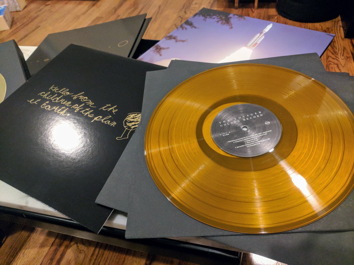 اهتدى ساغان وفريقه إلى صناعة إسطوانة فونوغرافية من النحاس قادرة على تسجيل الأصوات، وحرصوا أن يقوموا بطلائها بالذهب، حتى تكون مقاومة للصدأ، تم تضمين سطحها بإرشادات رسومية حول كيفية التشغيل، كما أرفقت معها حافظة وإبرة لاستقراء الصوت.