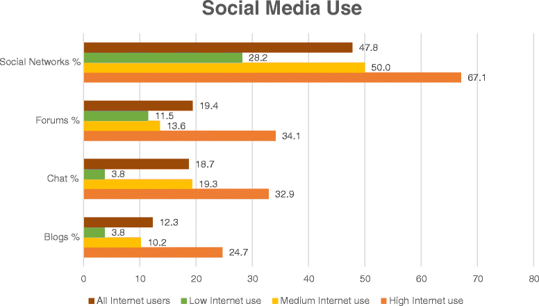 79.5٪ من عينة البحث هم من مستخدمي الإنترنت. تم استخدام وسائل التواصل الاجتماعي من قبل أقل من نصف المستخدمين: الشبكات الاجتماعية (47.8٪) ، والمنتديات (19.4٪) ، والدردشات (18.7٪) ، والمدونات (12.3٪). #دراسات_نفسيه