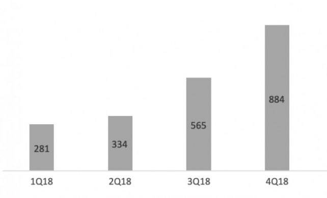 وبلغ صافي الإيرادات الإجمالية للمنتجات 209 مليون دولار أمريكي وهو ما يمثل زيادة بنسبة 557.6٪ في الربع الثالث من عام 2018