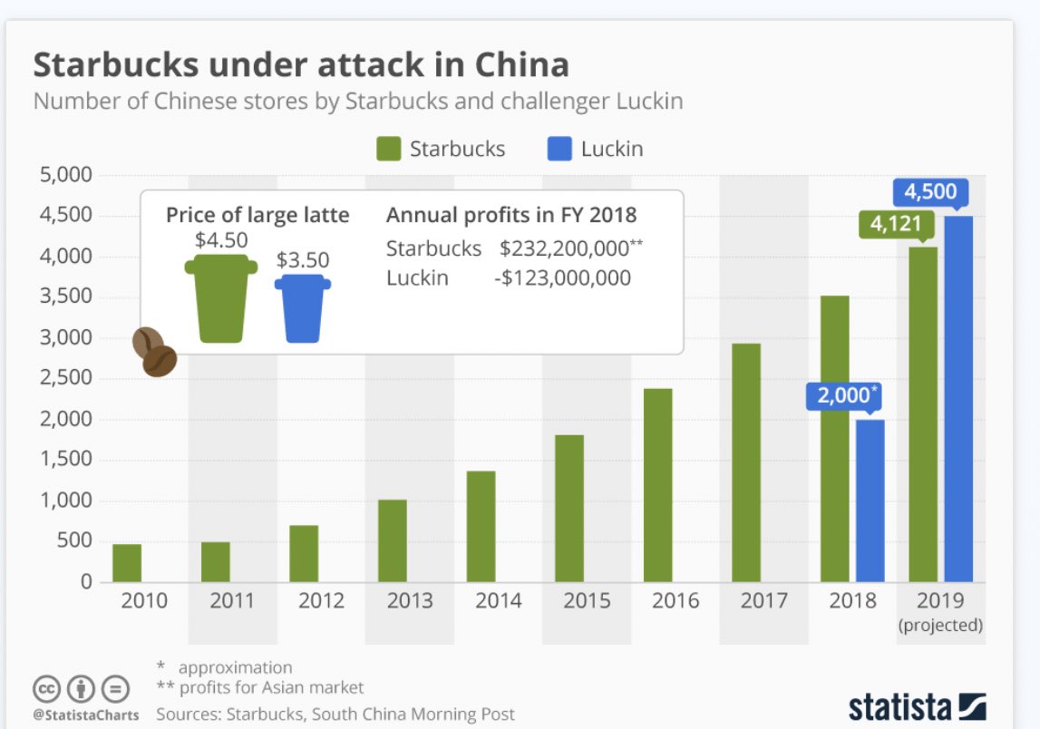 1. تخاول الشركة تخطي Starbucks كسلسلة قهوة رقم واحد في الصين مع مشروبات مخفضة والتوسع السريع.