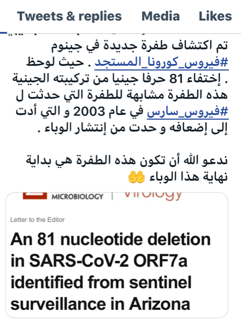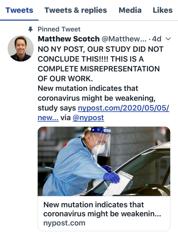 هنا تغريدة ماثيو سكوتش قائد الفريق البحثي ينفي أن نتائج بحثه تشير إلى ضعف الفيروس