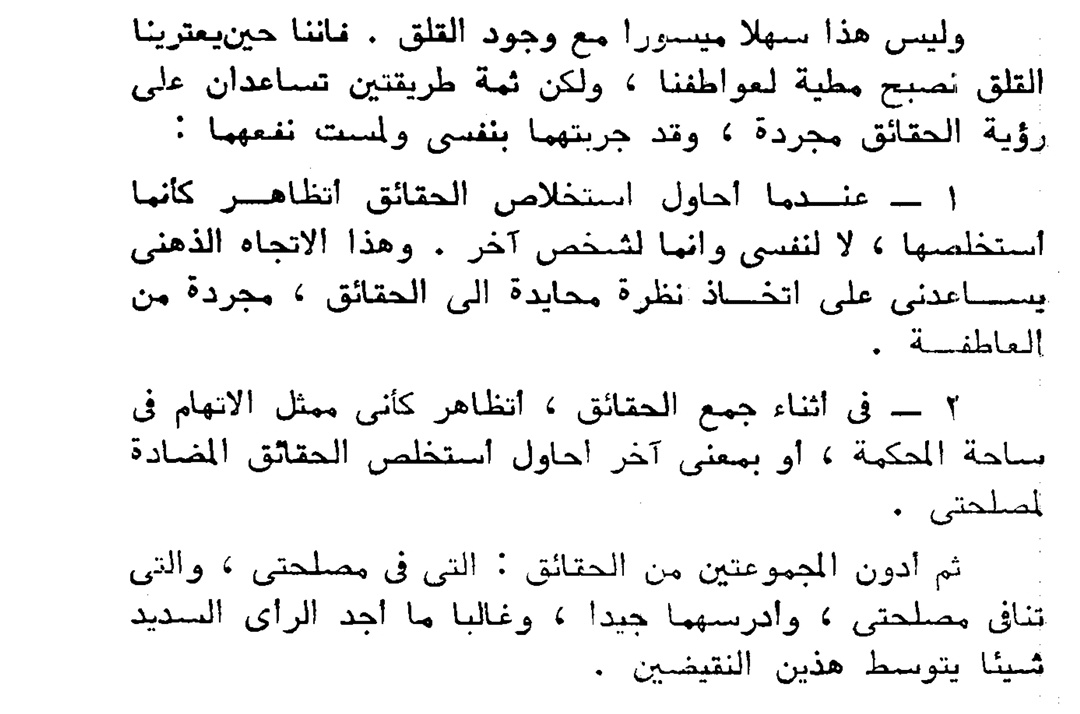 ١-استخلص جميع الحقائق، ودونها بخط يدك في ورقة واكتب المميزات والعيوب للقرار الذي يشغل بالك