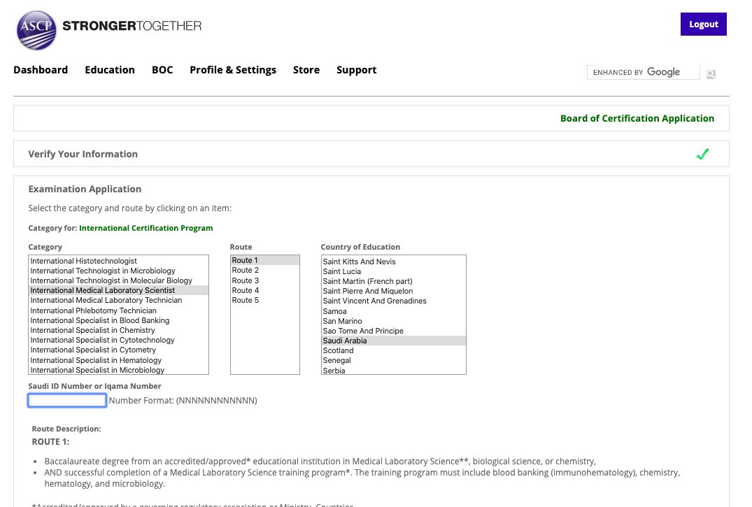 1⃣المسار الأول: المتقدم يجب أن يكون حامل لشهادة بكالوريس معتمدة في علوم المختبرات الطبية أو الكيمياء أو علوم الأحياء. بالإضافة إلى إكمال التدريب في أقسام المختبر و يجب أن تتضمن ( بنك الدم، كيمياء، علم الدم، مايكرو”