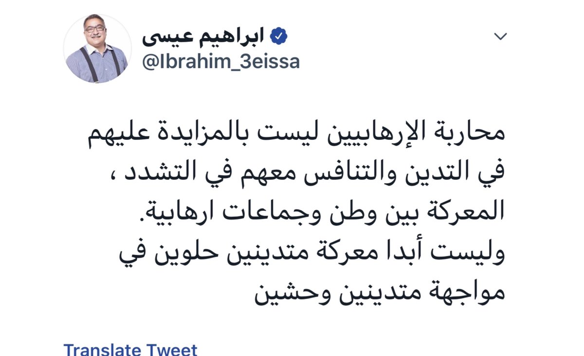-في الحالة المصرية من بعد ٢٠١٣ واحنا بنواجه دعاية بتحاول تظهر الدولة وكأنها في حرب مع الدين وبتقدم الفهم الاخواني الارهابي على انه الممثل الشرعي للدين، والاخطر من كده انها بتحاول تقدم غطاء ديني لقتال الجيش اللي بيتكون من افراد الشعب و اللي في الواقع الدين بيمثل جانب من تكوينهم