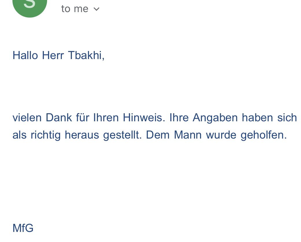 بالنهاية بعثت ملخص الفيديوهات لمكتب الاجانب التابع لهاي المدينة بالرغم من توصلي لرقم تلفونه بس انا لساتني طبيب مقيم وأصلا ما عندي خبرة كافية بالطب النفسي، واليوم وصلني الايميل التالي من طبيب مكتب الصحة للمقاطعة انه تم انقاذ الرجل وفعلا الايميل فرحّني جدا