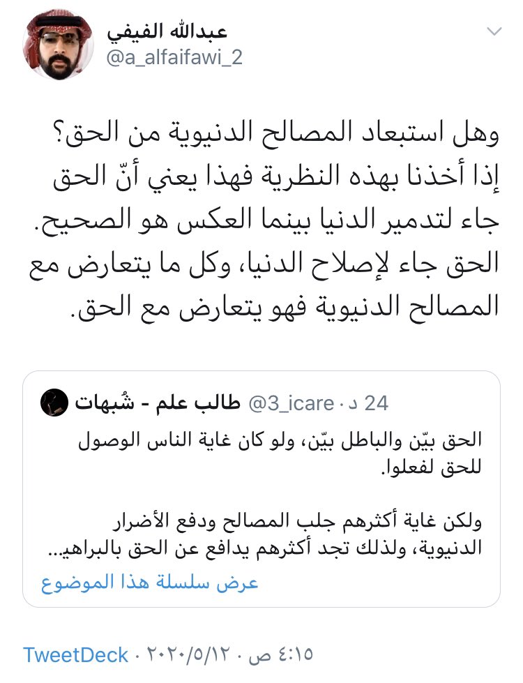 بعض أهل الباطل يستعرضون الحجج كأجود مايكون لنصرة الحق لو كان لهذا الحق مردود دنيوي لهم.