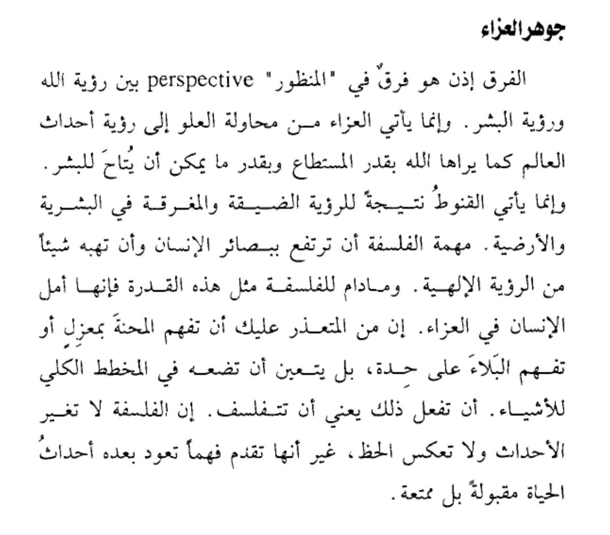 أن مُهمة الفلسفة هي أن ترتفع ببصائر الإنسان و أن تهبه شيئاً من الرؤية الإلهية،و مادام للفلسفة هذه القدرة فإنها أمل الإنسان ف العزاء،إن من المتعذر عليك أن تفهم المحنةَّ بمعزل أو تفهم البَلاَ ع حَدَة،بل يتعين أن تضعه ف المخطط الكلي للأشياء،أن تفعل ذلك يعني أن تتفلسف،إن الفلسفة لا👇
