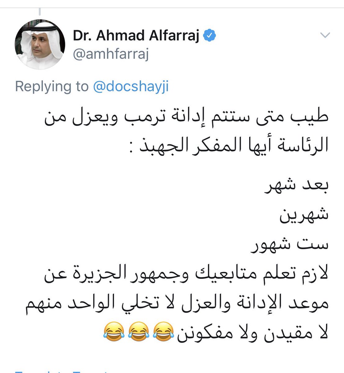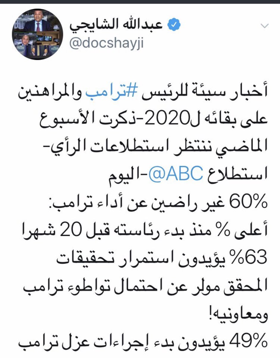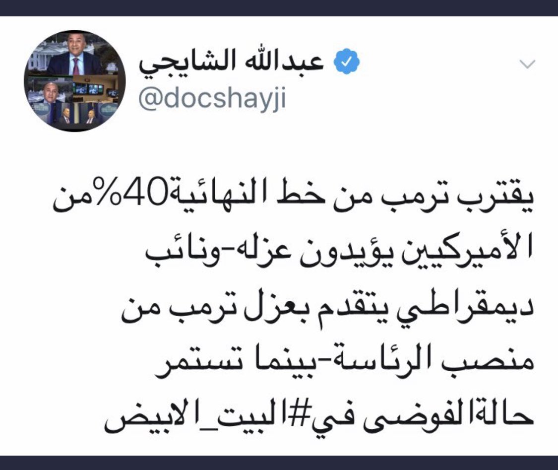 لم أكن أنوي العودة للحديث عن تنبؤ د.عبدالله الشايقي بعزل ترمب وردّي عليه بأن ترمب لن يعزل،وحينها حدث تفاعل كبير من المتابعين، وقالوا كلمتهم لي وللشايقي،بعدما ثبت خطأ تحليله الرغبوي وصحّة توقعاتي