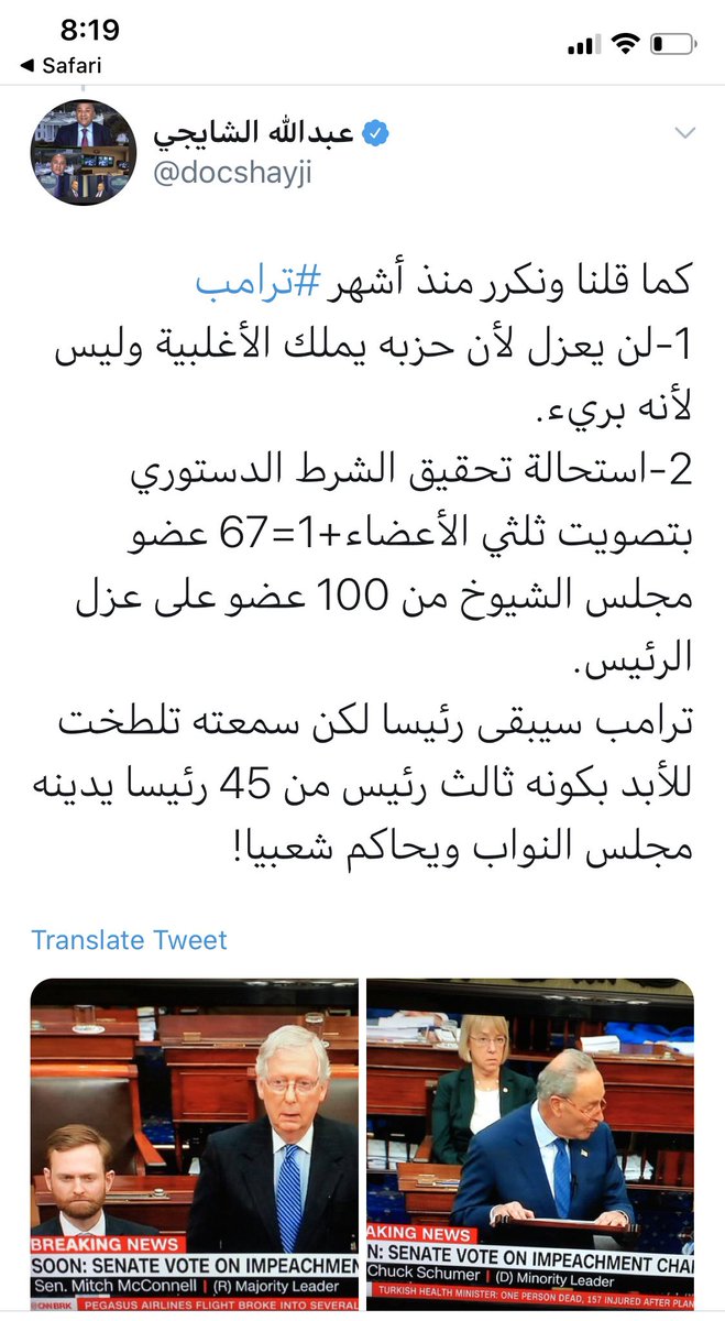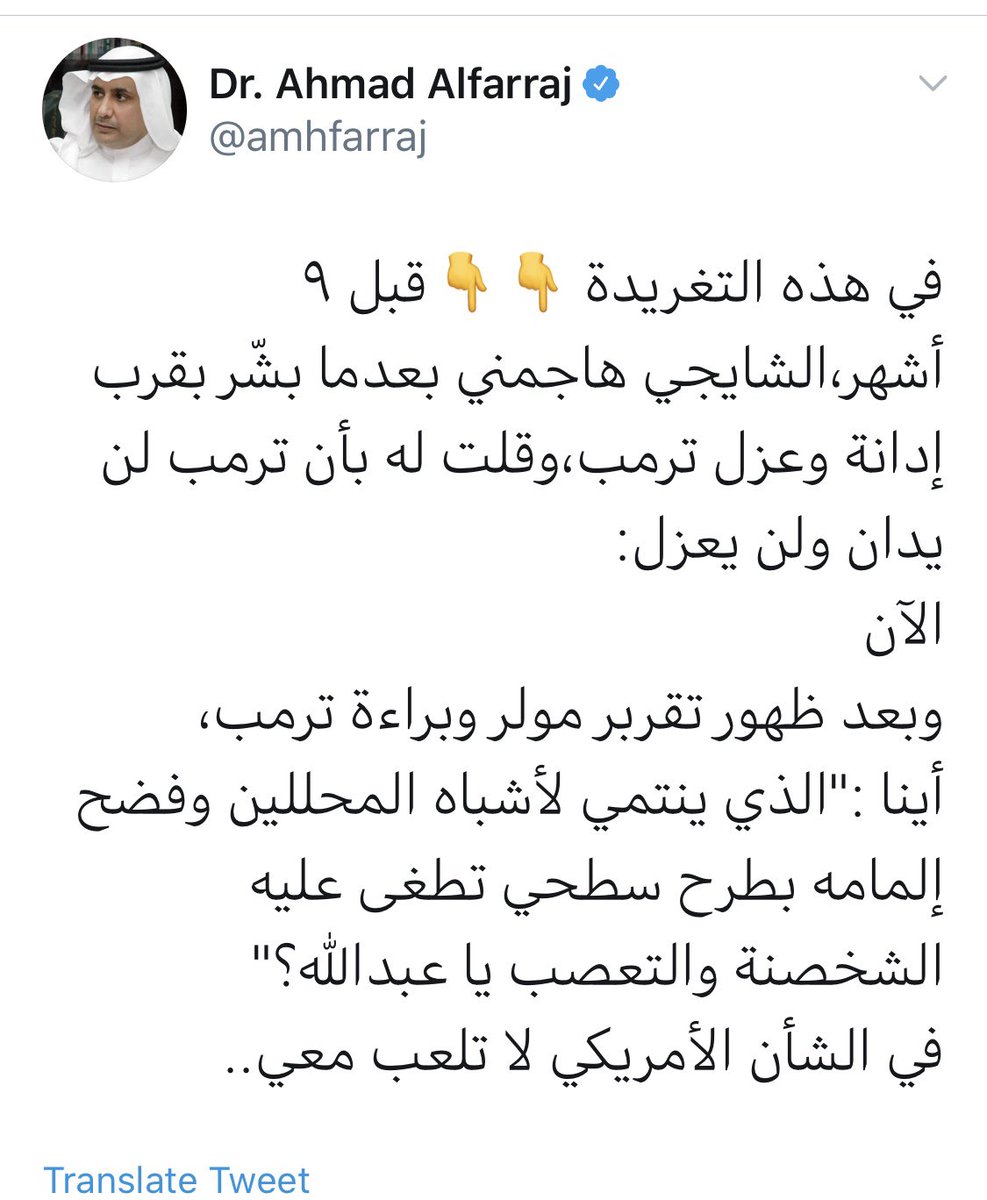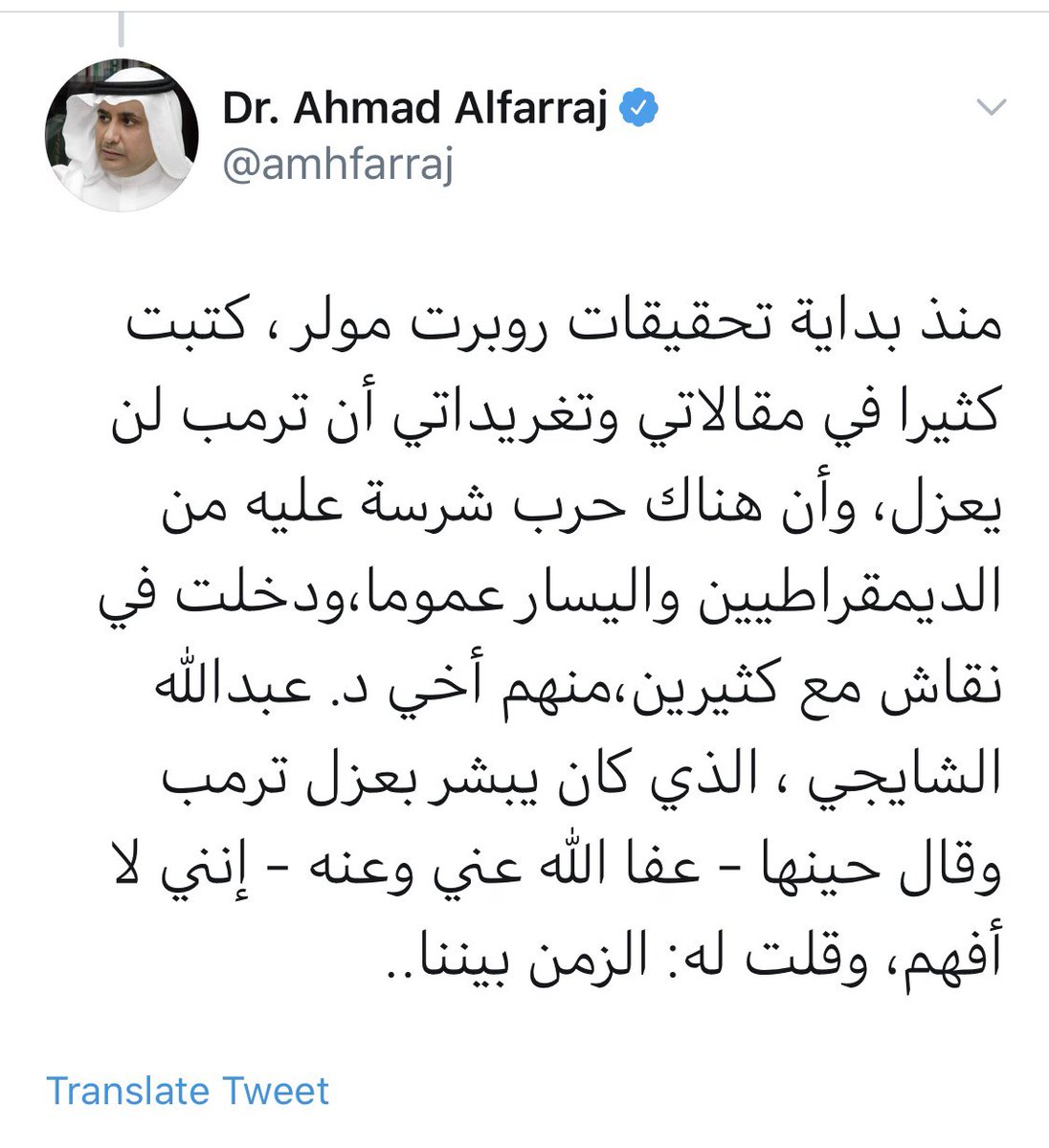 لم أكن أنوي العودة للحديث عن تنبؤ د.عبدالله الشايقي بعزل ترمب وردّي عليه بأن ترمب لن يعزل،وحينها حدث تفاعل كبير من المتابعين، وقالوا كلمتهم لي وللشايقي،بعدما ثبت خطأ تحليله الرغبوي وصحّة توقعاتي