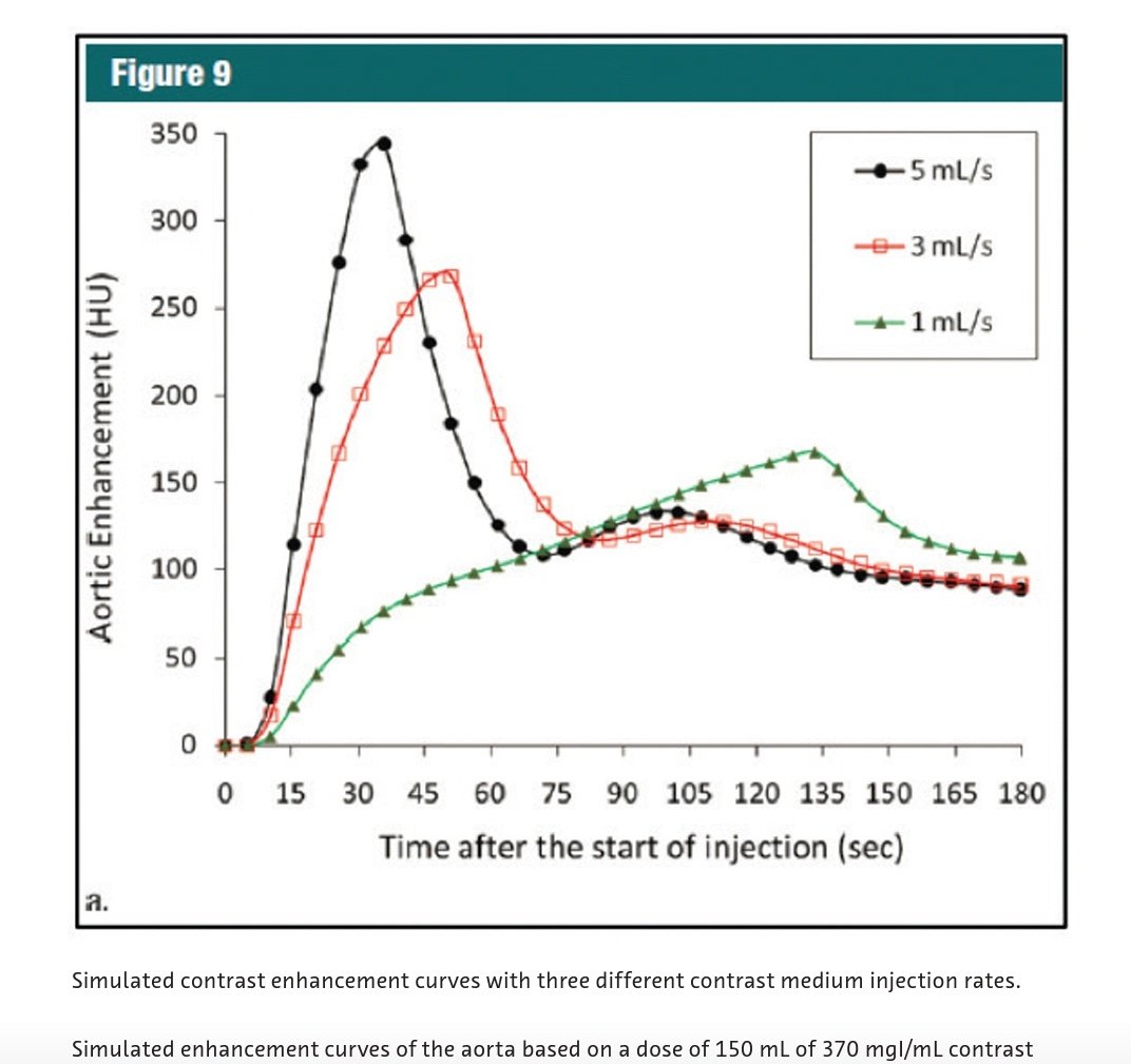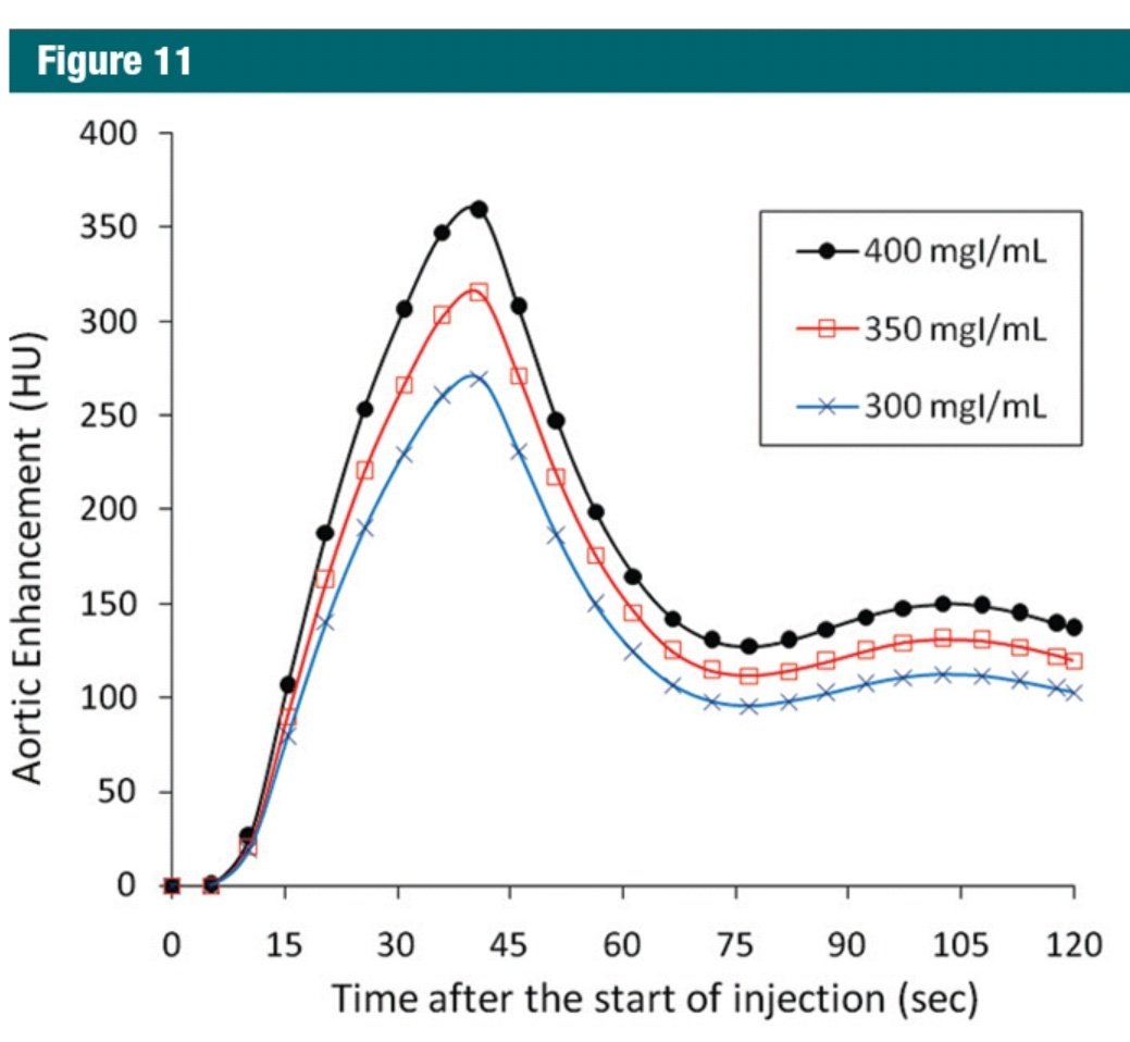 من المنحنى السابق نلاحظ أن الصبغة ذات التركيز الأعلى ستعطي enhancement أفضل في الشرايين وكذلك في الأوردة عند التصوير في زمن متأخر 60s كمثال.