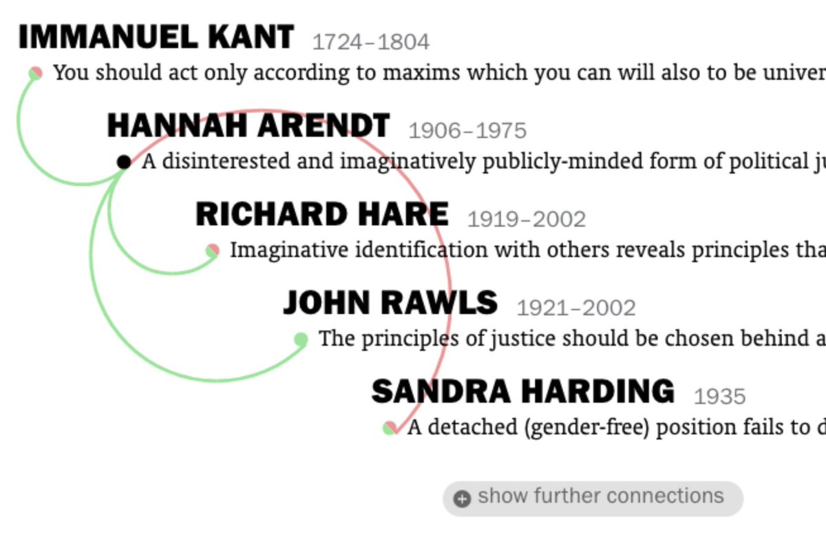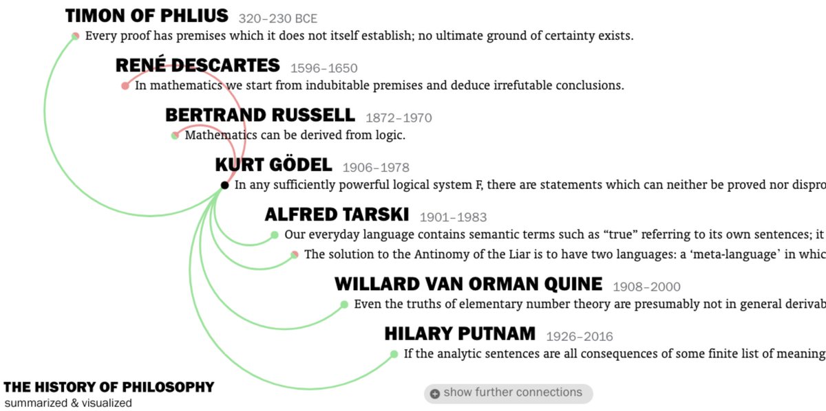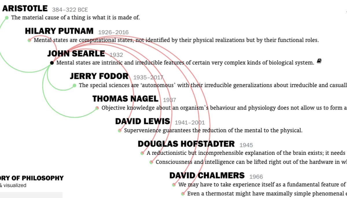 يعرض لك أهم حجج كل فيلسوف والخطوط الحمراء توصل بين الحجج المتناقضة والخطوط الخضراء توصل بين الحجج المتوافقة. وحينما تضغط على أي جملة يعطيك هذه الجملة فقط عند الفلاسفة الآخرين. شغل بديع بديع فوق الوصف يوضح لك القوة المعرفية الحقيقية لتصوير البيانات بهذ الشكل..