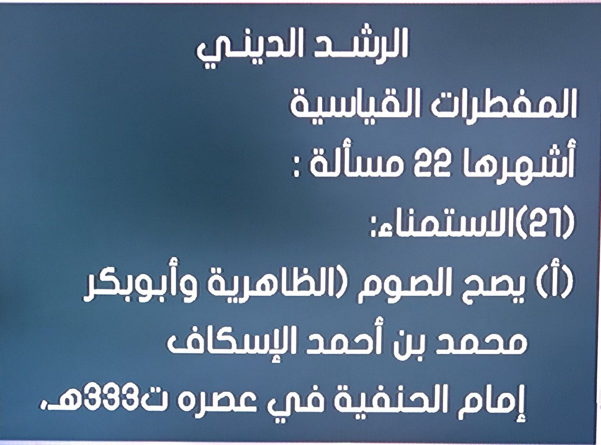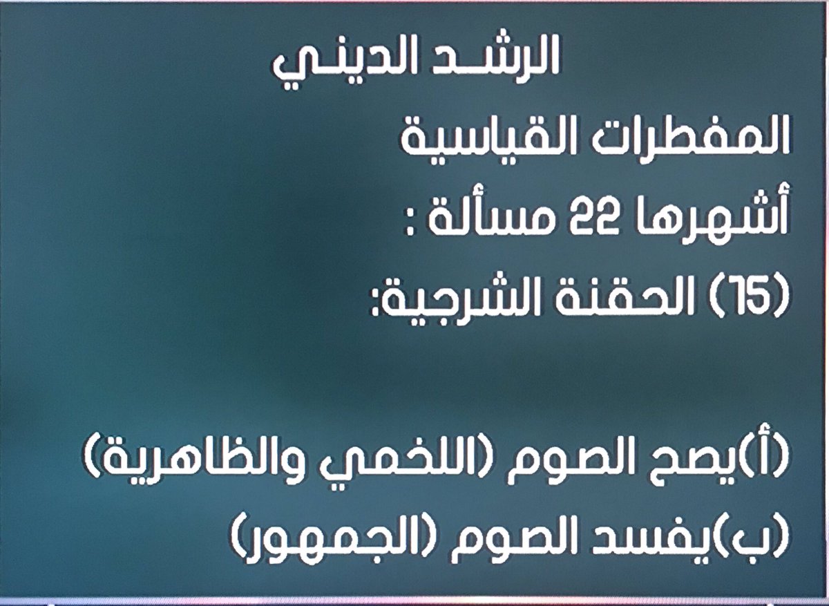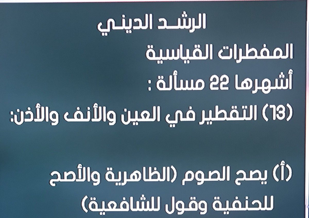 نعودلنكمل المفطرات القياسية التي بداناهاامس وهي مفطرات تقاس باجتهاد الفقهاء وكل منها لها من يؤيدها ولها من ينفيهالذا معرفتها لمنع الفتنة ومنها مضغ مالا يتفتت او ذوق الطعام بلا ضرورة والقطرة والكحل