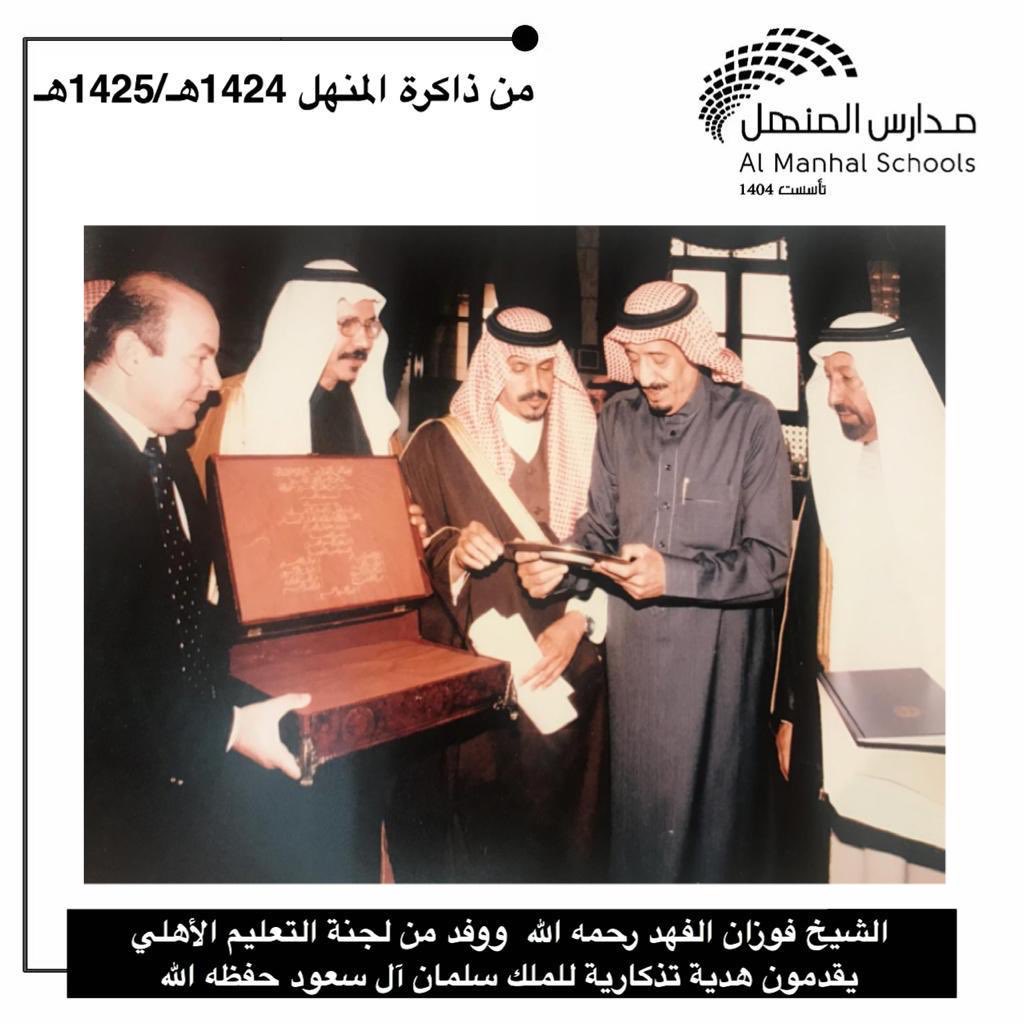 الشيخ فوزان الفهد -رحمه الله - بالنيابة عن أعضاء لجنة التعليم الأهلي يقدم درع المدارس الأهلية